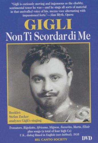 | 3 of 3 people found the following review helpful By This review is from: Gigli: Non Ti Scordar Di Me (DVD) This movie was made in the 1930's. It features the acting and voice of one of the greatest tenors and singers of all time, Beniamino Gigli. It is a rare treat to be able to hear and see such a wonderful artist who left the scene over 50 years ago! The story is VERY good. I won't go into details----just trust me on this one. It "gets to your heart". For a "mere pittance" that is less than the price of two movie tickets you can have one of the greatest singers of all time right there on your TV screen. And, you don't even need a "seance" to bring Gigli back! This movie is well worth the cost for the experience it provides. Buy it, you'll like it! :o) Email:boland7214@aol. 1 of 1 people found the following review helpful By This review is from: Gigli: Non Ti Scordar Di Me (DVD) After the great tenor Gigli was essentially dropped by the Metropolitan Opera, he went to Europe and made a number of films. I expected little from this 1935 curio, but it surprised me.The story, built around a series of musical numbers by Gigli, is quite effective. Well-written and well-acted by the lead actress, Gigli, and the rest of the cast. The language barrier between the leads is the most realistic depiction I've seen in a film of people attracted to each other but unable to communicate because they don't speak the same language. The early scenes aboard the ocean liner are very well-done and give one the real flavor of crossing the Atlantic in the 1930s. And there is real suspense about how it will end. This is no great film, but you do care about the characters. I was nearly biting my nails to find out what decision the conflicted heroine would make at the end. This is not the film to appreciate Gigli's brilliant singing, which... Read more 4 of 6 people found the following review helpful By Beth "bethiejw2" (Mesa, AZ United States) - See all my reviews This review is from: Gigli: Non Ti Scordar Di Me (DVD) Non Ti Scordar Di Me is an old melodramatic movie that stars the opera star Beniamino Gigli. A woman marries a lonely widowed father (Gigli) on a rebound. When the old lover enters back into her love she has to choose between responsiblity and love. The plot of the movie is generic but the music makes up for it. Gigli doesn't have much of a movie persona here, but then this was his first role. He makes up for it with his amazing tenor. The movie is in English, though the songs are in Italian and not subtitled. 2.5 rounded to 3. |